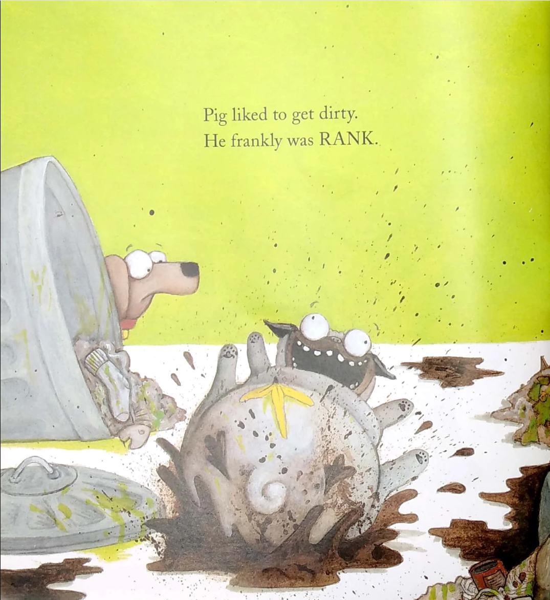 うわっ、くっさ〜! ピグは世界一のよくばりパグだけじゃなくて、世界一よごれたパグでもあります。そろそろおふろに入らないと大変! でも……ピグにそれを言っても、ぜんぜん聞いてくれません。